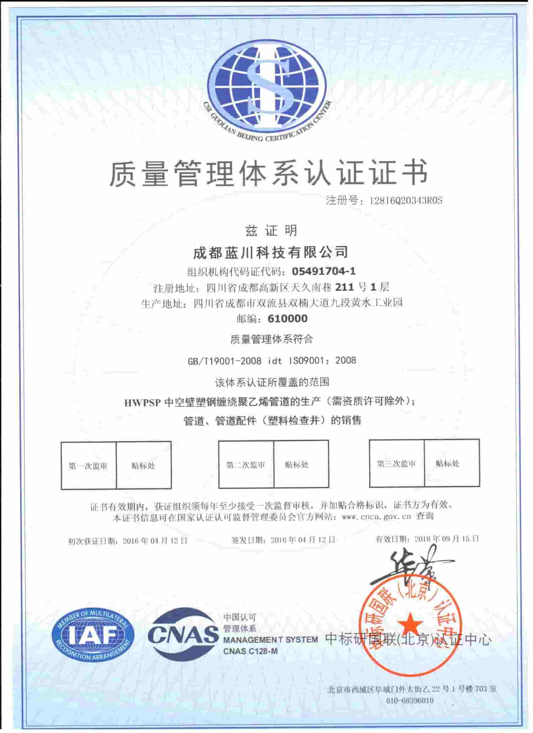 四川藍川管道有限公司(成都藍川科技有限公司)成立于2012年,生產基地坐落于“牡丹之城”四川彭州市工業開發區,營運中心位于成都市高新區益州大道,注冊資本5仟萬,占地面積2萬余平米,年生產能力達1萬噸以上;是一家專業研發、生產、銷售新型市政工程管道的高新技術企業。目前擁有大型市政排水管生產線5條,給水管生產線5條,電力管生產線2條。主要產品有:防脫層鍍鋅鋼骨架纏繞管、雙層壁克拉管、雙色中空壁塑鋼纏繞管、方形雙壁立筋纏繞管、內肋管、雙壁波紋管、給水管、電力管、硅芯管等。 公司是四川省湖南商會“常務副會長單位”和“創新湘商”,中國塑料加工工業協會“塑料管道專業委員會會員單位”,獲得了30余項發明專利和實用新型專利,2020年評為《高新技術企業》,公司通過了《質量管理體系認證證書ISO9001:2015》,《職業健康安全管理體系認證證書OHSAS18001:2018》,《環境管理體系認證證書ISO14001:2015》;公司于2019年主編了《雙色防脫層玻璃纖維增強鍍鋅鋼骨架纏繞管》T/SCSX0906-2019,《雙壁纖維網鋼塑復合管》T/SCSX0916-2019,兩項團體標準,并獲得了四川建設科技發展中心頒發的《四川省建設領域科技成果或應用技術備案證書》;公司“藍川”牌雙孔雙色共擠中空壁塑鋼纏繞聚乙烯管道、GSRC雙色雙層共擠玻纖增強防脫層鍍鋅鋼骨架纏繞管、方形雙壁立筋纏繞管、玻璃纖維增強內肋硅芯層塑料電纜導管系列產品多次被中國企業發展促進委員會、中國優質品牌統計中評定為“綠色環保推薦企業”、“工程建設推薦產品”、“質量.服務誠信AAA企業”、“質量檢驗.國家標準合格產品”、“中國自主創新產品”。